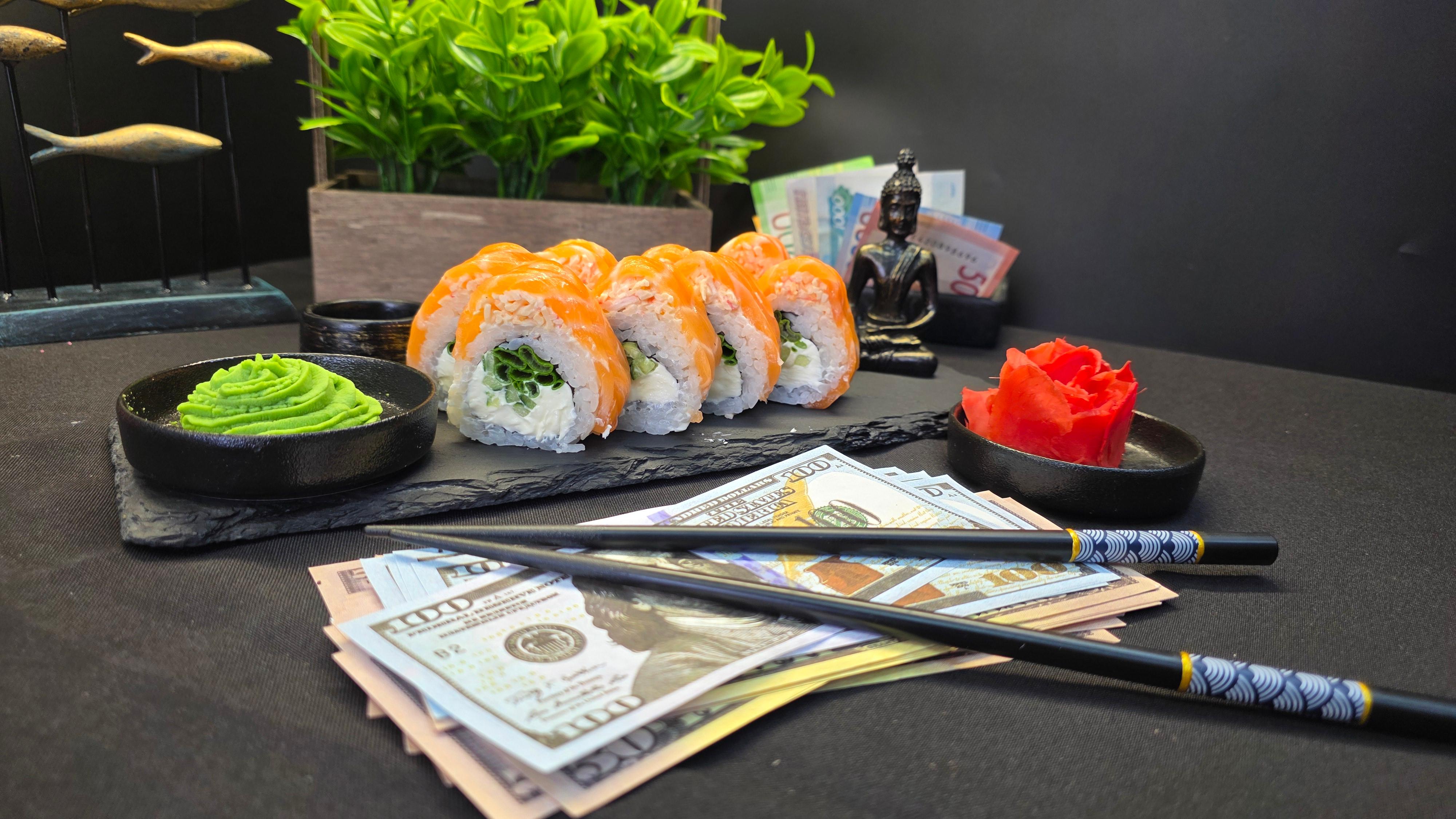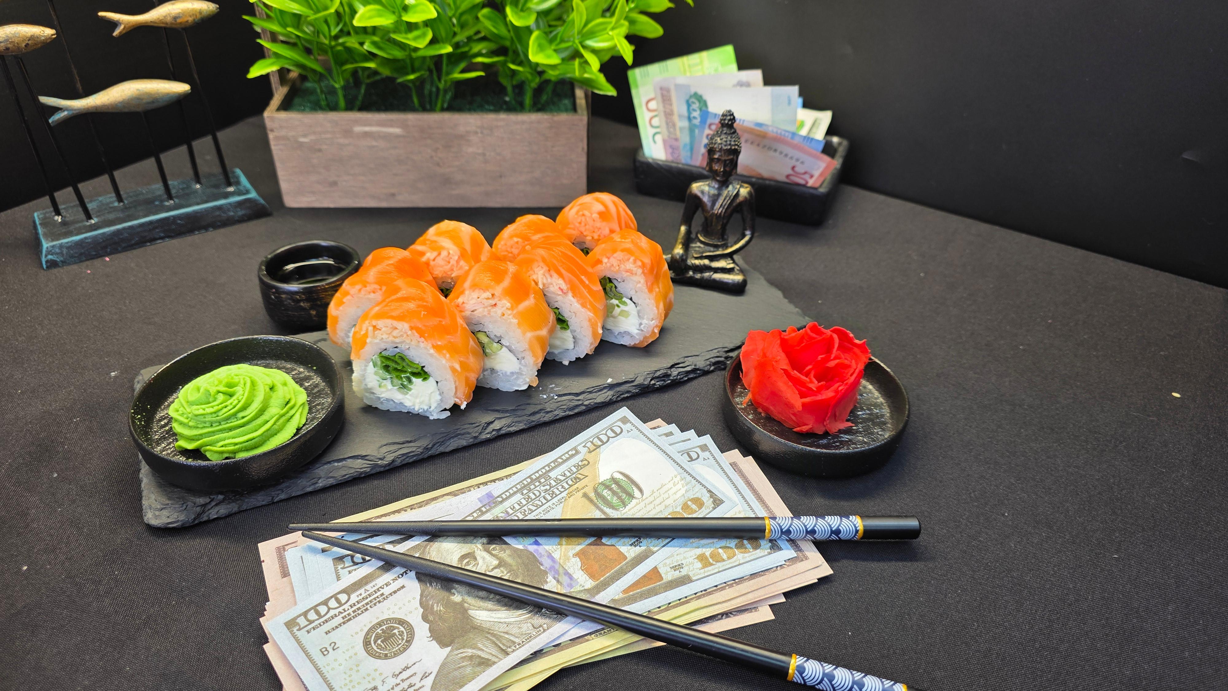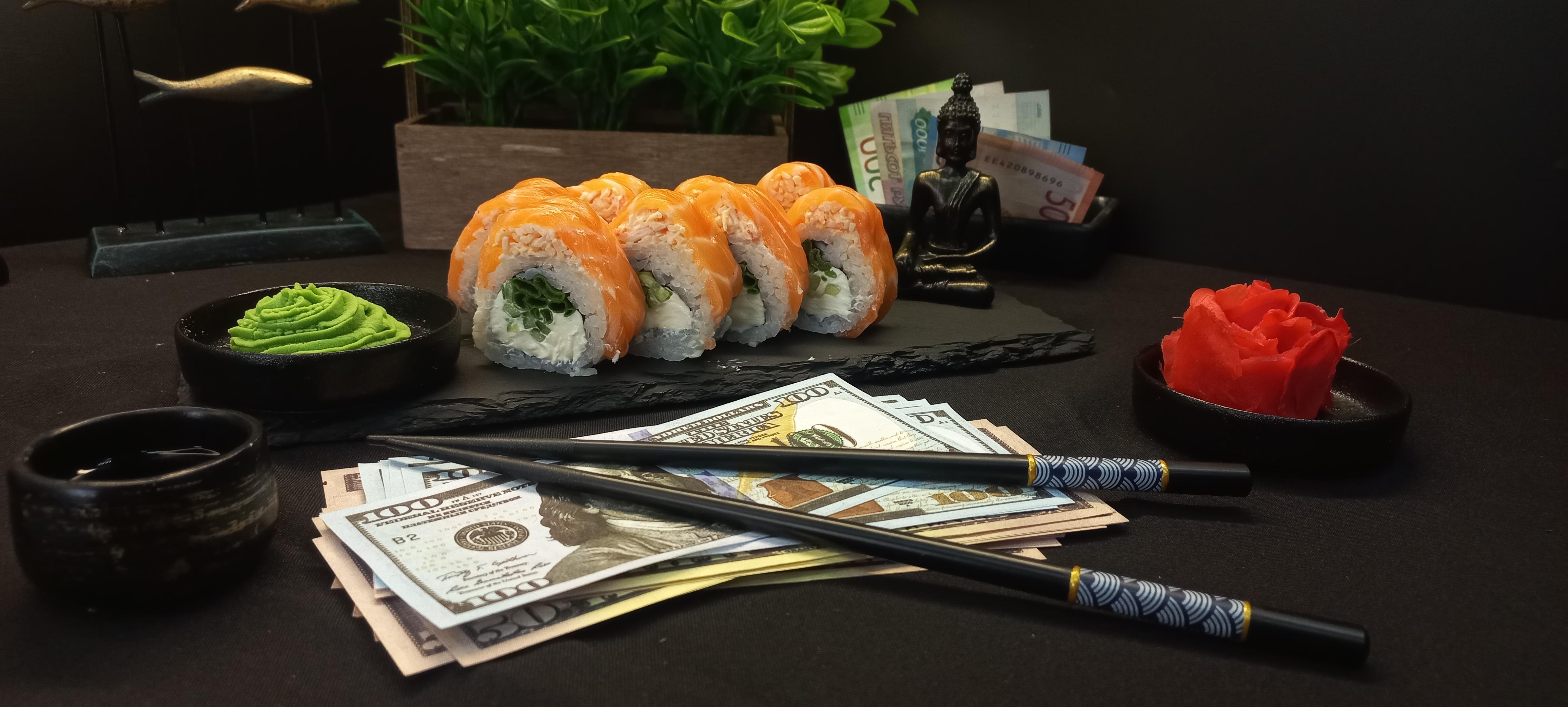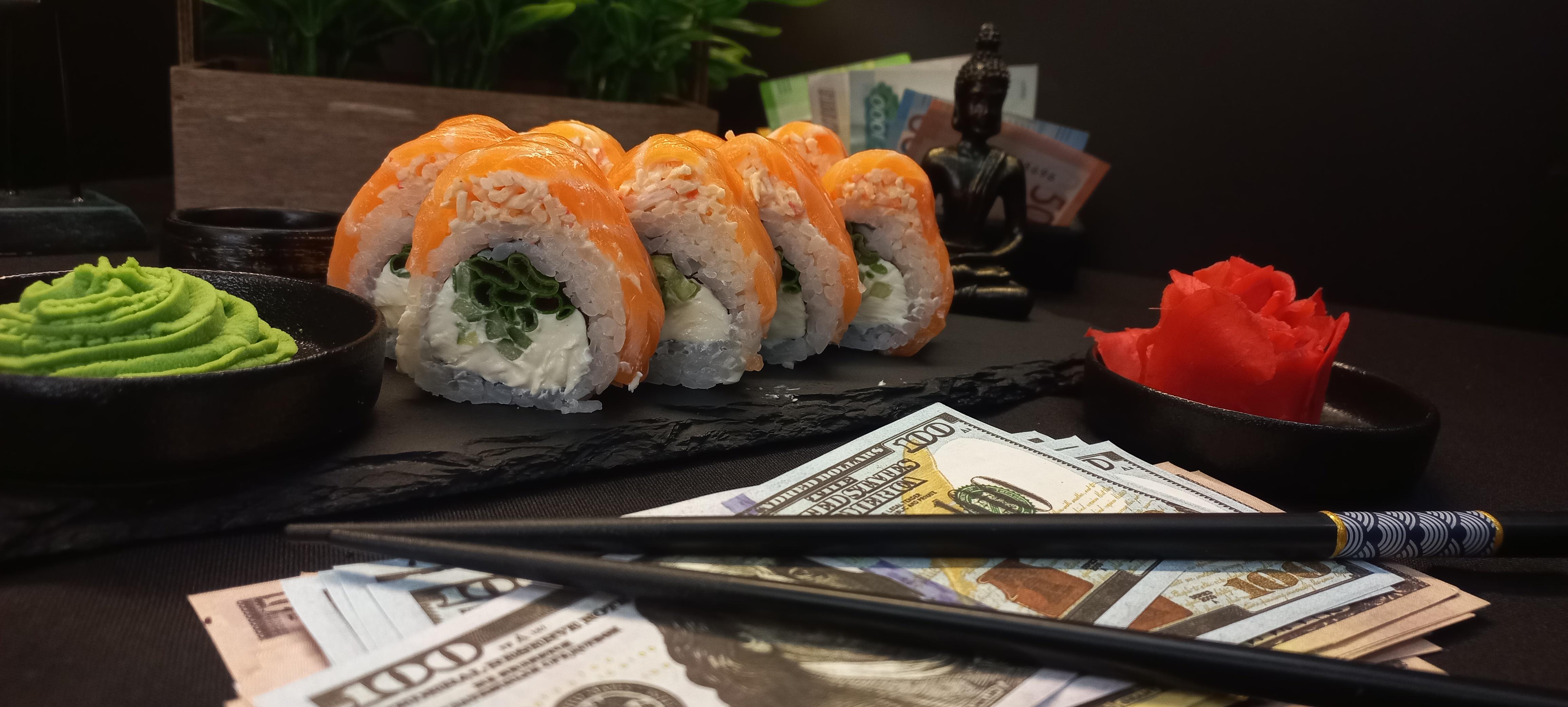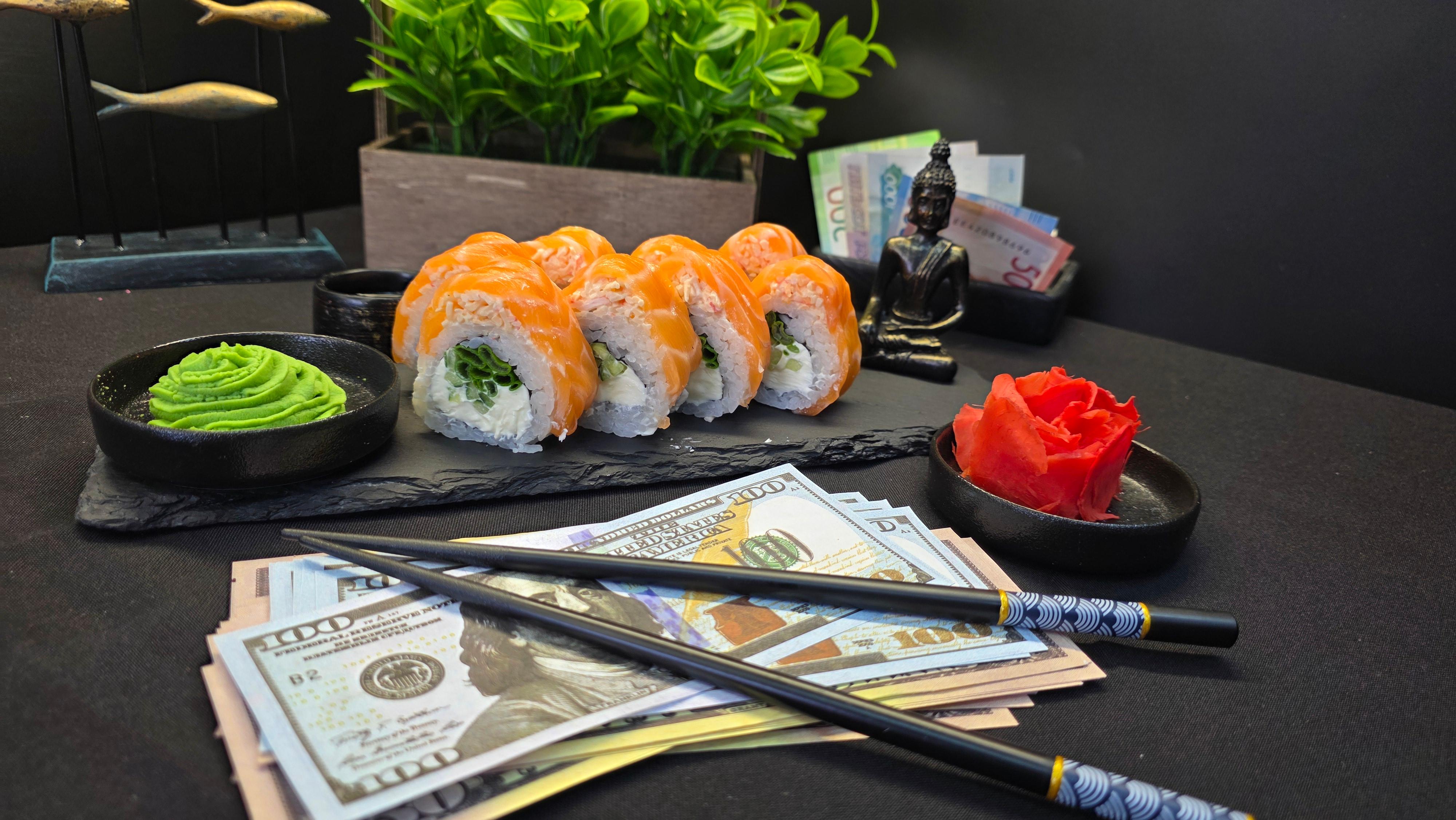 🍣 ОПИСАНИЕ ВКУСА: «Нежное мясо краба и слабосолёный лосось образуют альянс премиум-класса, подкреплённый кремовой “Филадельфией” и лёгкой остротой зелёного лука. Майонез связывает вкусы, как успешная сделка, а огурец добавляет хрустящую свежесть. Это ролл для тех, кто ценит классику с инвестиционной стабильностью». ✅ Нори (лист водорослей) ✅ Рис для суши ✅ Сливочный сыр (Филадельфия) ✅ Свежий огурец ✅ Зеленый лук ✅ Майонез ✅ Мясо краба ✅ Лосось ( свежий или слабо соленный ) 290 гр.