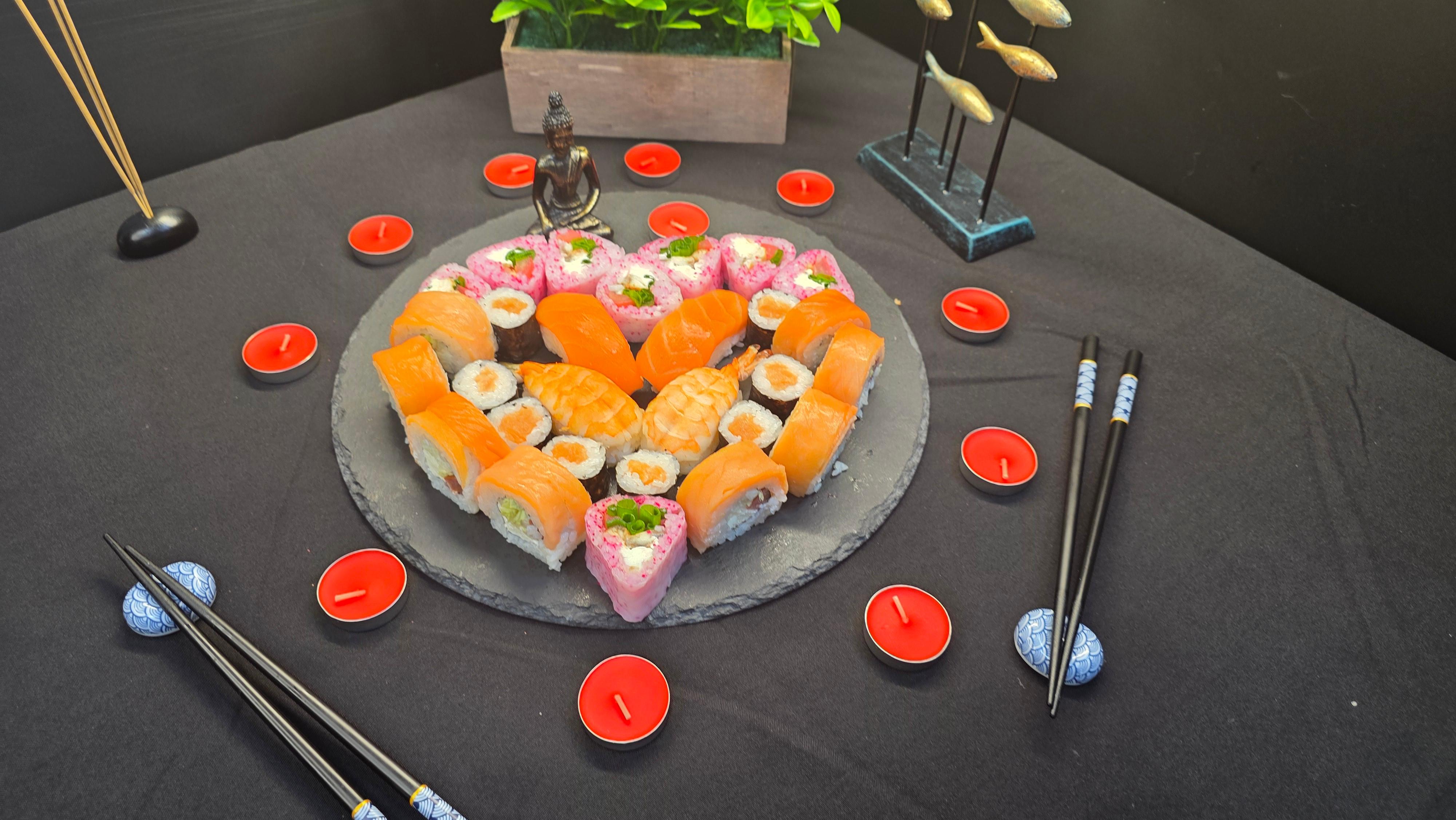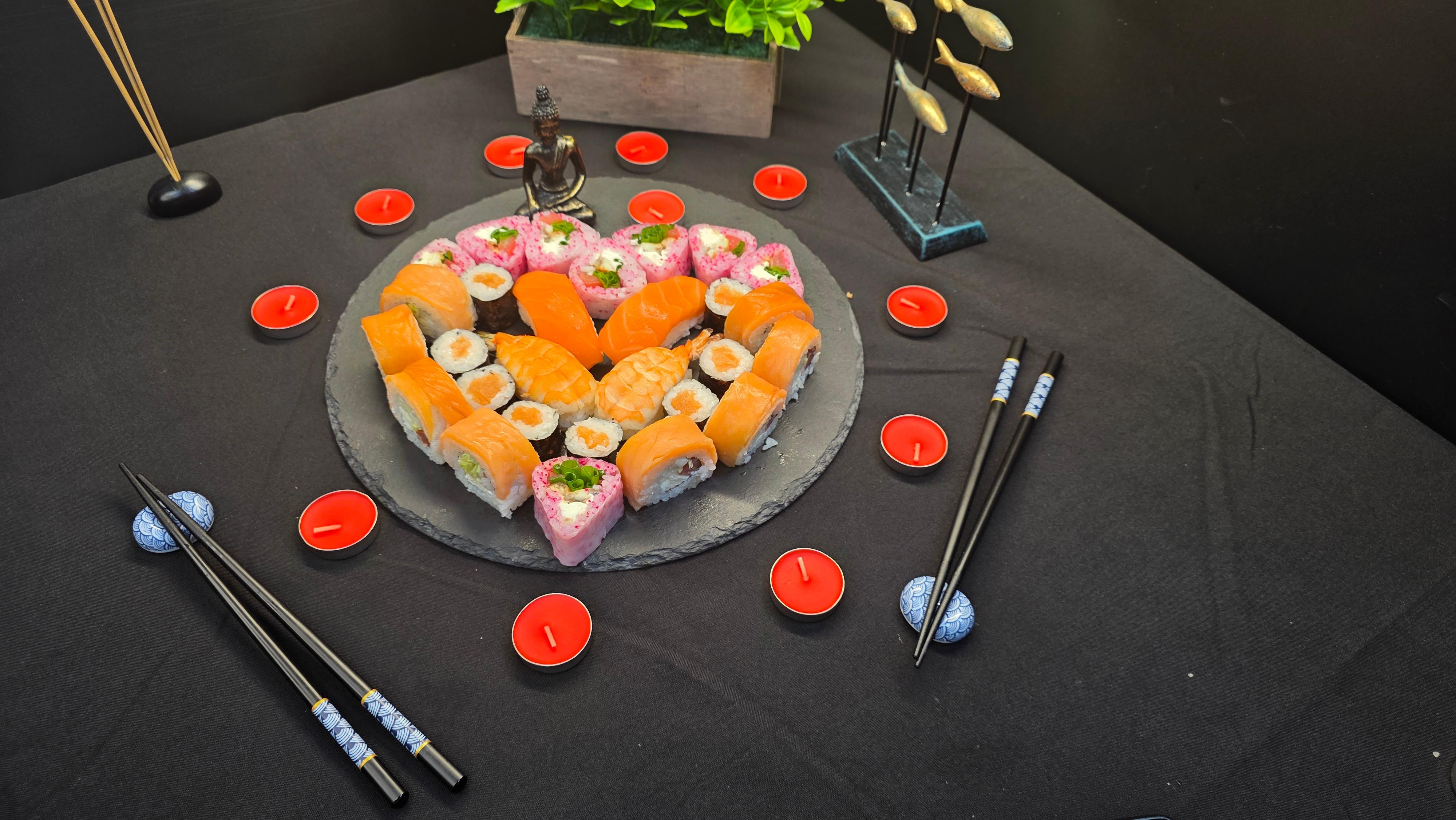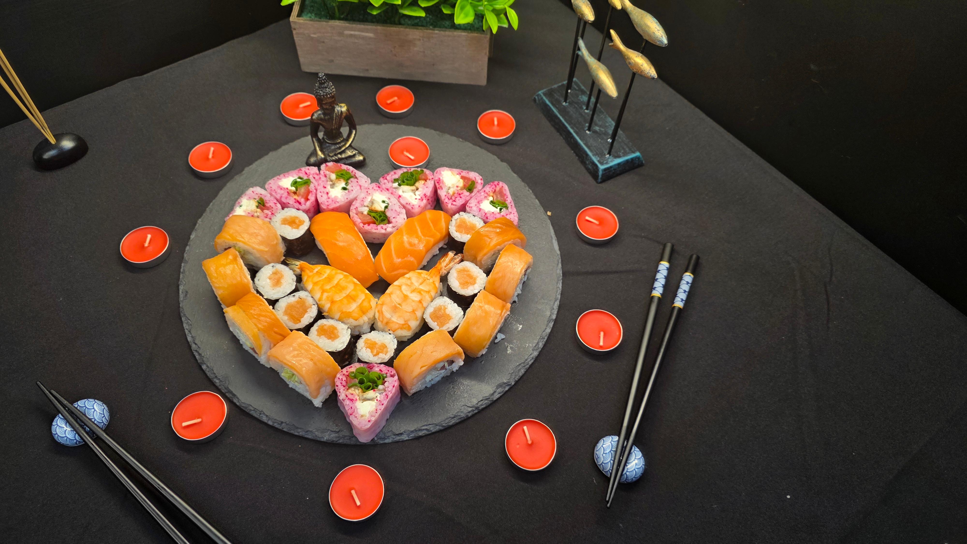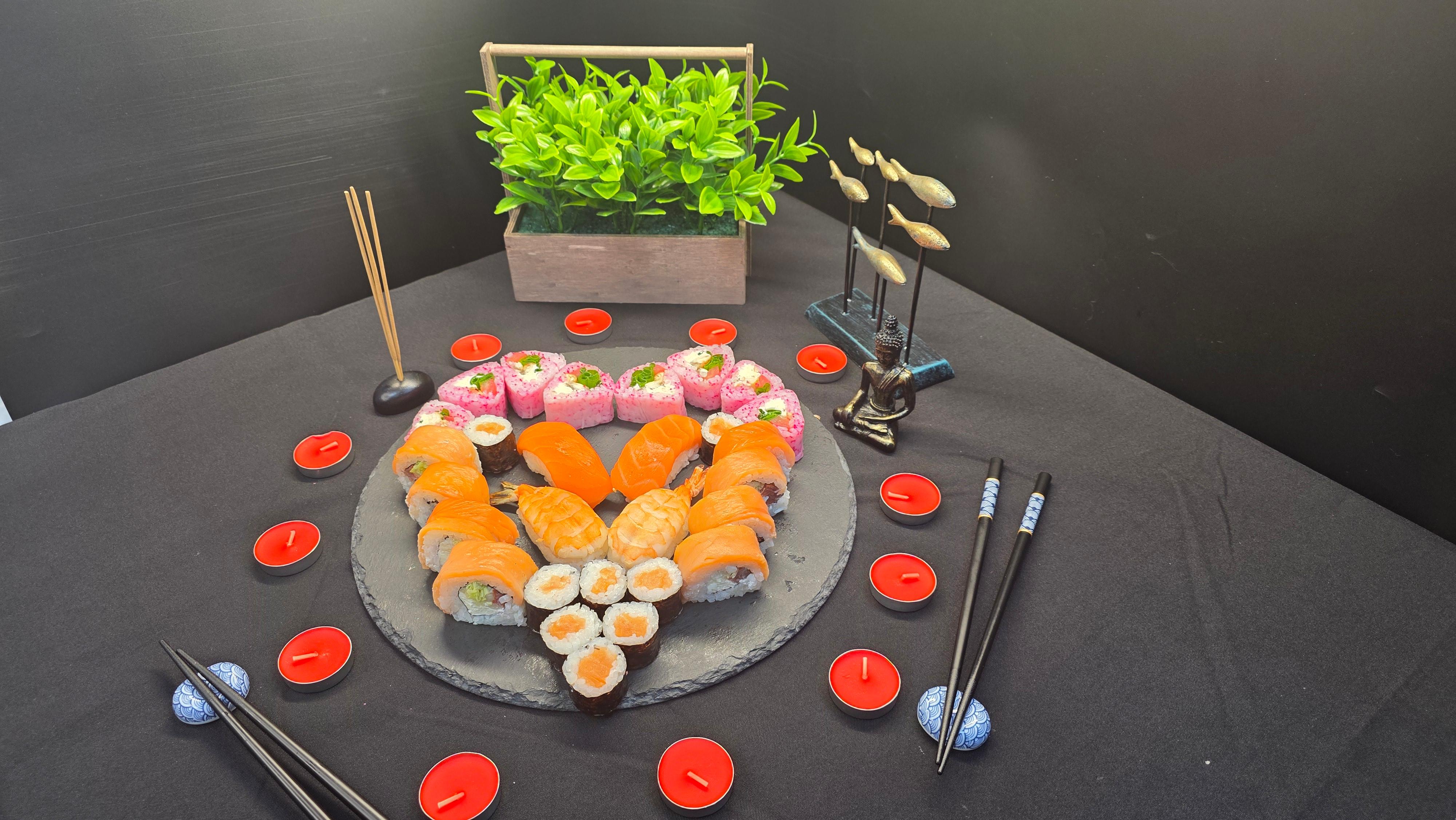 (Тот самый сет, ради которого стоит погасить свет... и зажечь свечи!). Ваш безотказный гастрономический инвестиционный план на вечер. В составе — всё, что нужно для переговоров о капитуляции: страховой полис из четырёх суши, три хладнокровных ролла, умеющих размягчить оборону, и наш главный козырь — романтические свечи , сэт начинённый намёками и ... P.S. Результат не гарантируем, но статистика — на вашей стороне. Приятных переговоров! Форма сердечка — не просто подача, это намёк на ваши намерения. А свечи — чтобы было видно, в чью пользу принято решение. ✅ Сяке макки ✅ Суши Сяке 2 шт. ✅ Суши Эби 2 шт. ✅ РУБИН ✅ ПЕКИНСКАЯ МОНЕТА ✅ свечки 750гр.