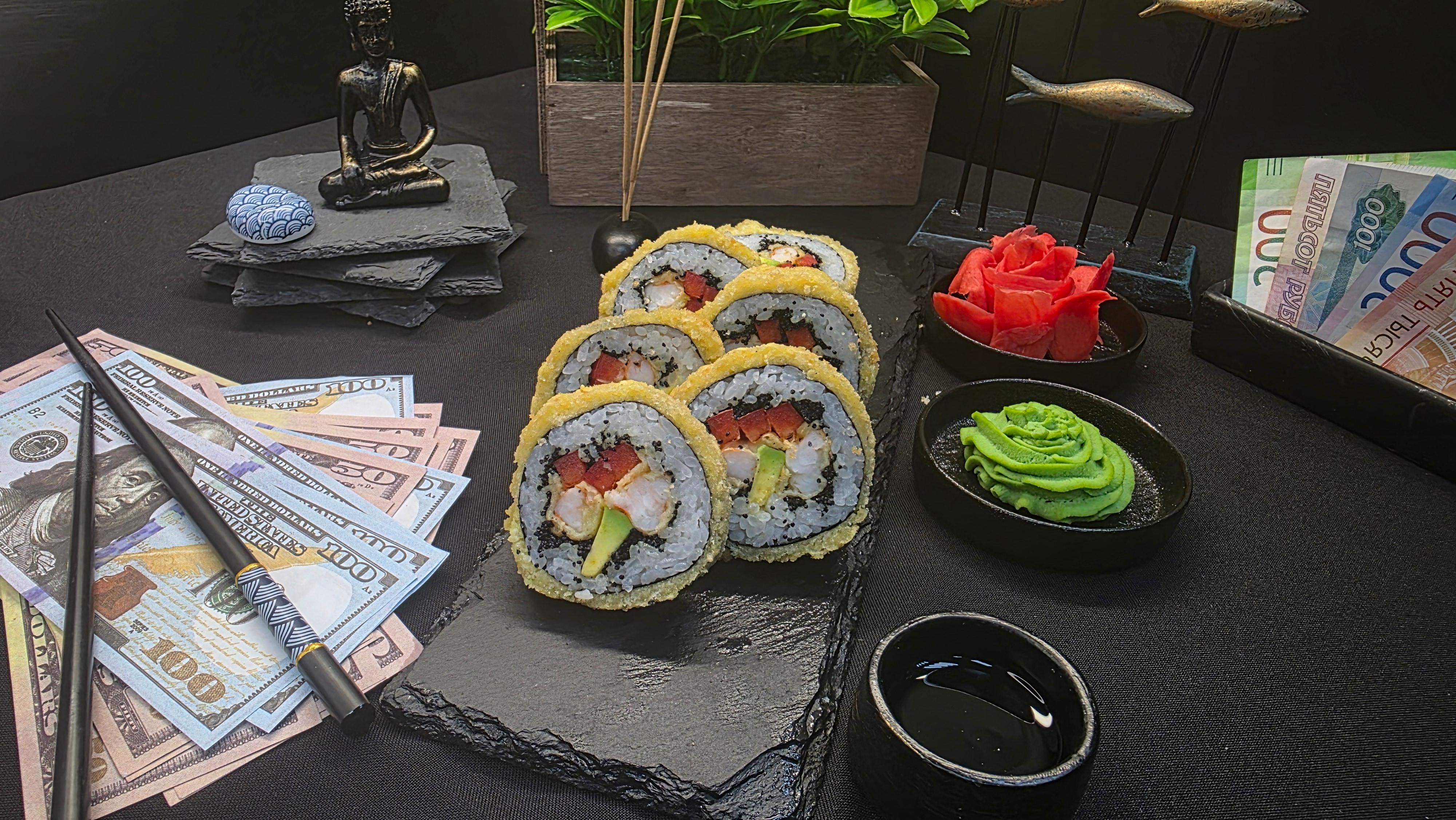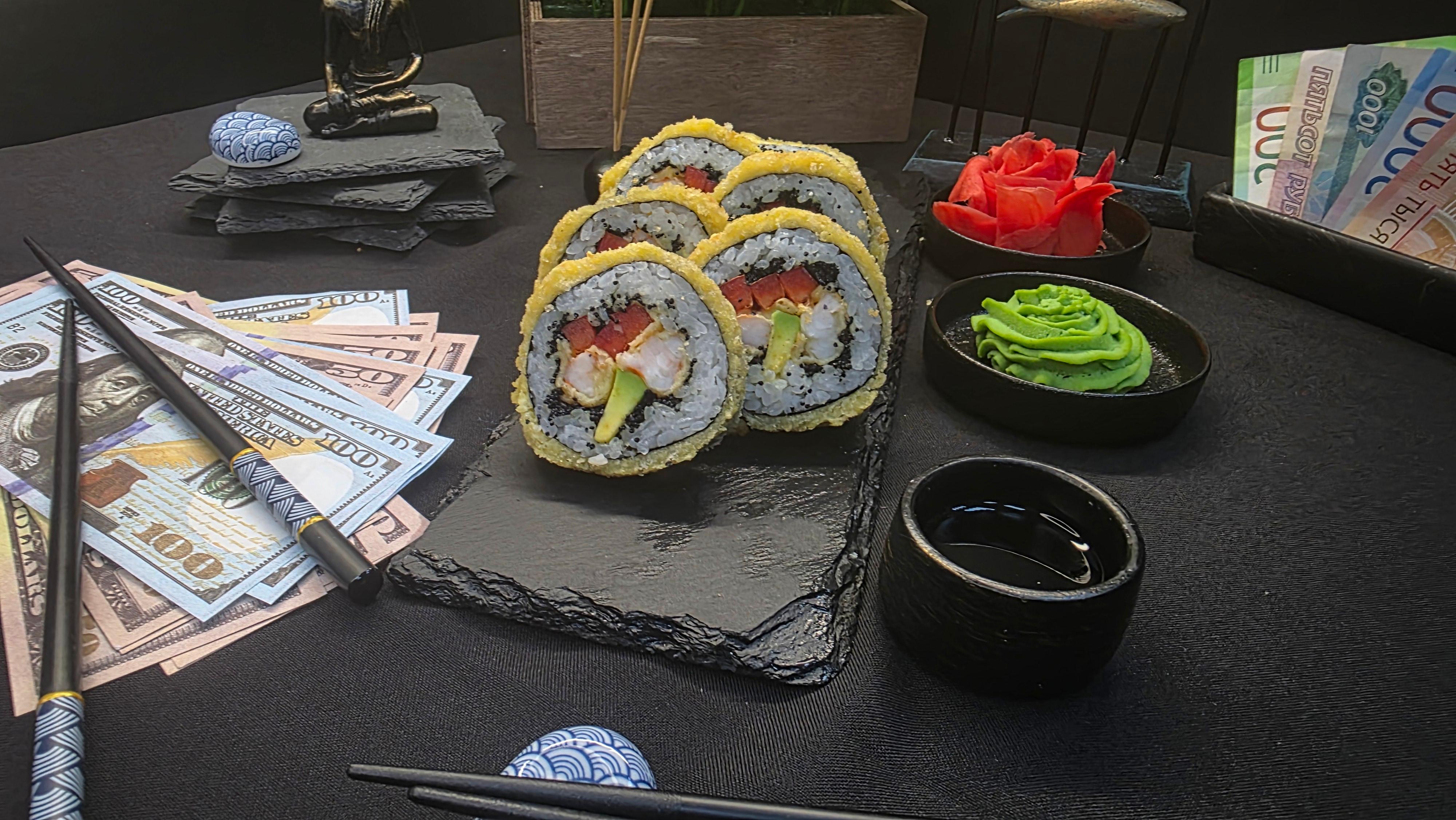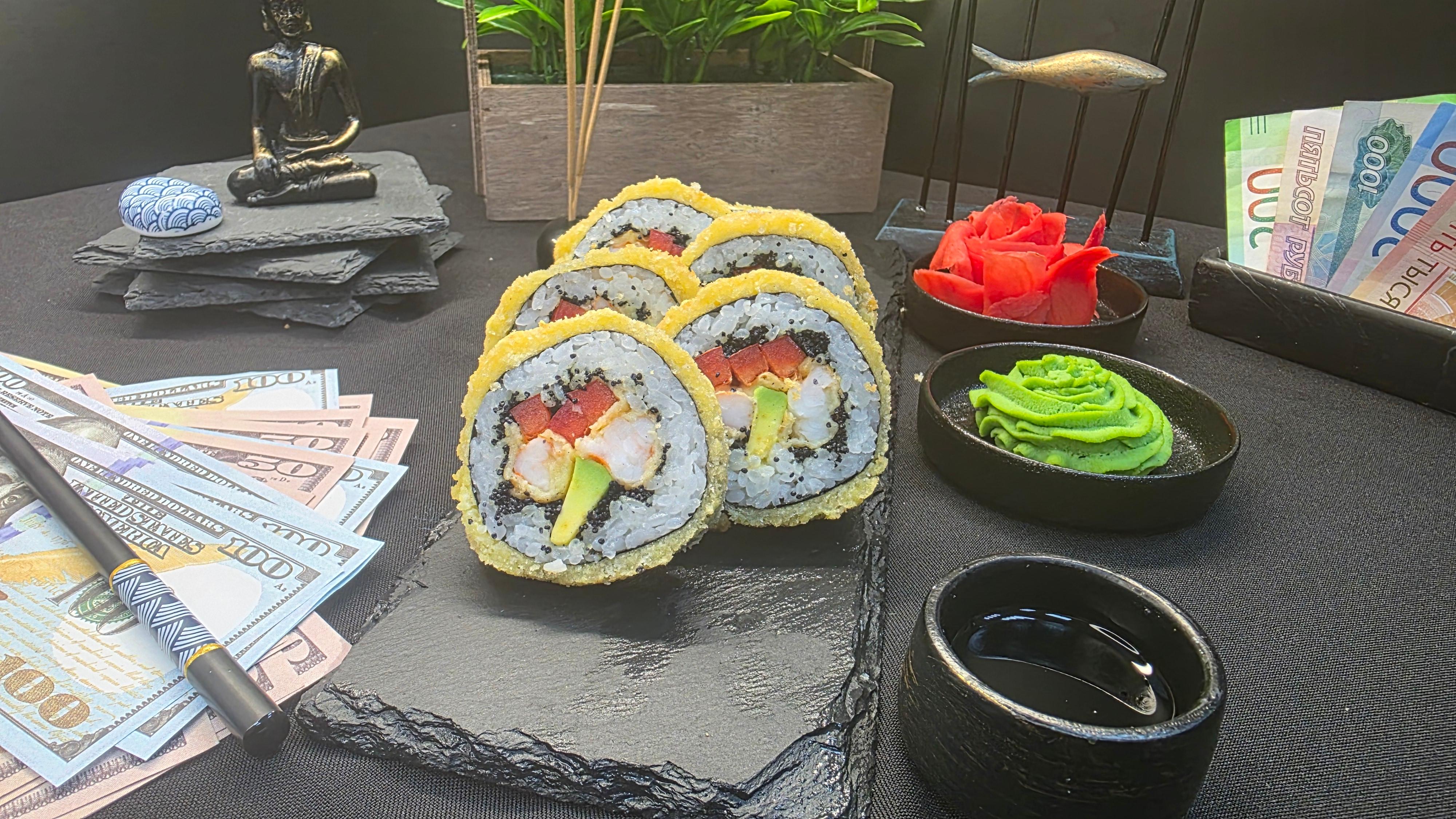 Золотистый хрустящий кляр, скрывающий нежнейшие креветки темпура и сливочные ломтики авокадо, украшенный эксклюзивной черной икрой тобико. Болгарский перец добавляет сочную сладость, а нори и рис создают идеальный фон для этого драгоценного сочетания. Каждый укус — это добыча трофея: хруст кляра, тающие креветки, нежность авокадо, взрывы икры и свежесть перца. Роскошь, достойная истинных ценителей ✅ Нори (лист водорослей) ✅ Рис для суши ✅ Тобико черное ✅ Авокадо ✅ Креветки темпура ✅ Перец болгарский ✅ Кляр 215 гр.